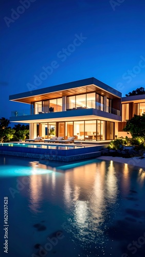 Modern luxury villa by pool at night