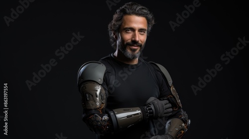 Modern Man in Futuristic Robotic Arm Armor Black Background Studio Portrait