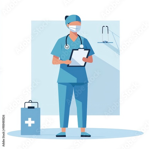medicals, assistant, health care, professional, nurse, clinic, hospital, doctor, white, coat, clipboard, stethoscope, modern, minimalistic, vector, illustration, minimalist, clean, design, isolated, soft, colours, female, character, uniform, scrub, health, exam