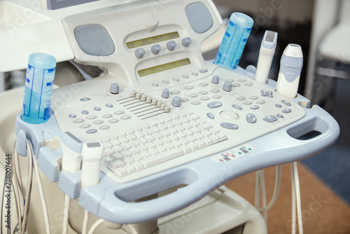 Modern medical equipment in the clinic. An ultrasound machine. Elastography and sonography. Doctor with a modern ultrasound machine, scanners and sensors close-up.