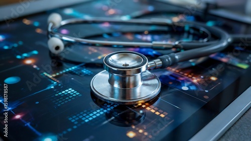 stethoscope, medicals, health care, technology, digital, circuit, board, innovation, datum, abstract, glowing, blue, colourful, science, medicine, research, diagnosis, treatment, health, future, modern, electronic, computer, network, connection, information, analysis, biotechnology, pharmaceutical, doctor, nurse, patient, care, equipment, instrument, symbol, concept, background, closeup, detail, macro, advanced, futuristic