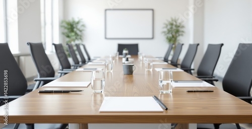 meeting, office, table, interior, design, architecture, chair, modern, workspace, corporate, business, contemporary, furniture, professional, organisation, teamwork, boardroom, workplace, planning, strategy, collaboration, clean, minimalist, light, wooden, bright, elegant, stylish, layout, setup, environment, space, productivity, innovation, technology, communication, leadership, brainstorming, discussion, efficiency, idea, presentation, note, glasses, water, decor, ai, generative, illustration