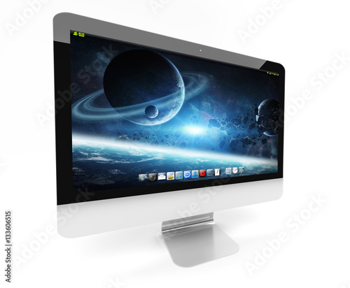 computer, screen, monitor, display, desktop, lcd, equipment, device, tech, modern, technology, digital, design, white, background, blank, metal, metallic, multimedia, cyberspace, isolated, silver, black, mock, up, mock-up, connect, connection, connexion, cyberspace, business, three-dimensional, render, earth, network, illustration