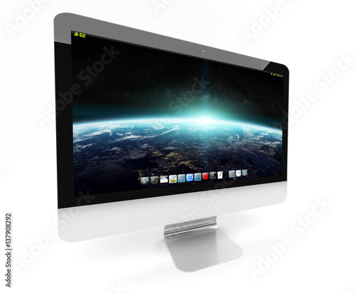 computer, screen, monitor, display, desktop, lcd, equipment, device, tech, modern, technology, digital, design, white, background, blank, metal, metallic, multimedia, cyberspace, isolated, silver, black, mock, up, mock-up, connect, connection, connexion, cyberspace, business, three-dimensional, render, earth, network, illustration
