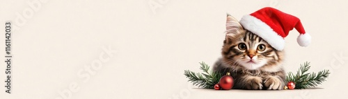 Modern Minimal Illustration of a Tabby Cat Wearing a Santa Hat with Holiday Decorations on a Soft Background