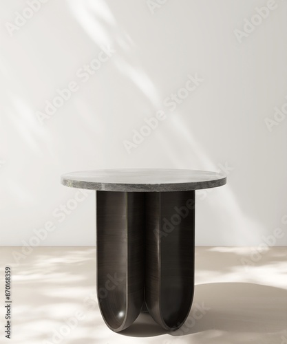 Modern, minimal round black stone pedestal table podium in dapple sunlight, shadow on white wall, beige floor for luxury organic cosmetic, skincare, body care, beauty product background 3D