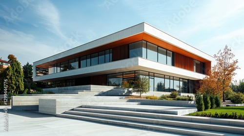 modern, minimalist, architecture, contemporary, house, building, design, exterior, window, nature, sky, landscaping, tree, grass, stair, structure, facades, glasses, sunlight, geometric, symmetry, urban, residential, lawn, sleek, stylish, elegant, roomy, garden, backyard, terrace, perspective, view, property, modernist, luxury, home, linear, rectangular, balance, harmony, autumn, leaf