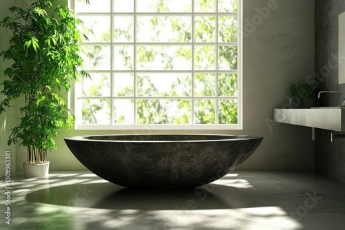 Modern minimalist bathroom with a unique dark stone freestanding bathtub, natural light, and greenery.