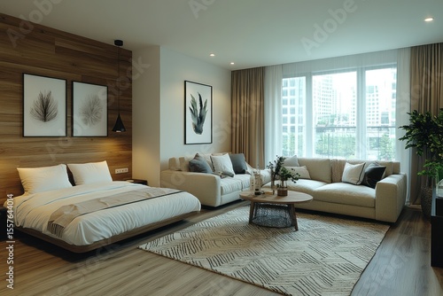 modern, minimalist, bedchamber, living, area, interior, design, cosy, comfortable, roomy, contemporary, neutral, warm, light, wooden, flooring, furniture, sofa, bed, decor, art, plant, natural, stylish, home, apartment, elegant, calm, relaxing, space, simple, clean, bright, soft, minimal, room, carpet
