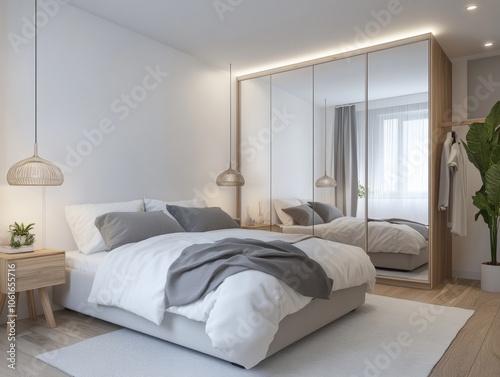 bedchamber, interior design, modern, minimalist, contemporary, white, grey, bed, bedding, blanket, pillow, bedside table, nightstand, lamp, lighting, wood, mirror, closet, clothes rack, floor, rug, decor, furniture, home, house, apartment, living space, cosy, comfortable, restful, relaxing, serene, peaceful, style, trend, inspiration, home decor, real estate, property