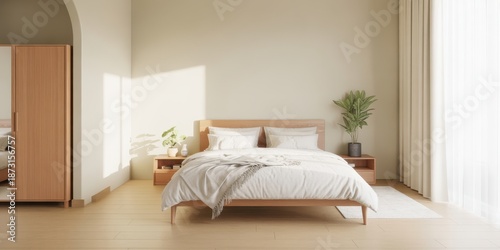 Modern Minimalist Bedroom Interior with Light Wood Furniture and Archway
