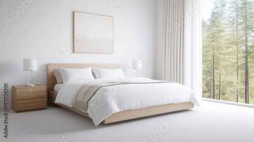 bedchamber, minimalist, modern, natural, light, white, wooden, bed, cosy, calm, peaceful, simple, decor, design, interior, lighting, furniture, comfortable, sleep, relaxation, clean, contemporary, elegant, view, window, tree, nature, linen, sheet, blanket, rug, space, room, home, living, house, style, photo, visualisation, rendering, neutral, stylish