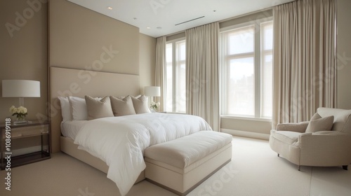 modern, minimalist, bedchamber, neutral, tone, roomy, layout, large, window, elegant, bedding, cosy, armchair, tranquil, ambience, interior, design, decor, stylish, furniture, relaxation, peaceful, nobody