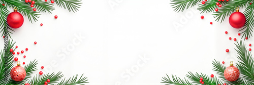 Modern minimalist Christmas border featuring red ornaments and holly berries on a white gradient background, elegant holiday decor concept.