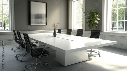 modern, minimalist, conference, room, large, white, table, chair, black, office, meeting, business, sleek, contemporary, design, interior, architecture, professional, corporate, elegant, sophisticated, stylish, workspace, furniture, clean, line, simple, bright, light, window, natural, plant, vase, artwork, grey, wall, floor, sunlit, space, executive, comfortable, seating, polished