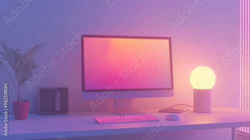 desk, computer, keyboard, mouse, lamp, light, ambient, minimal, modern, setup, workspace, office, technology, digital, aesthetic, pink, purple, gradient, colours, glow, warm, cool, style, design, clean, simple, elegant, room, home, interior, plant, palm, pot, speaker, white, table, desktop, screen, illuminated, relaxed, calm, atmosphere