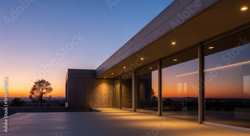 Modern minimalist house terrace with sunset reflection on glass facade.