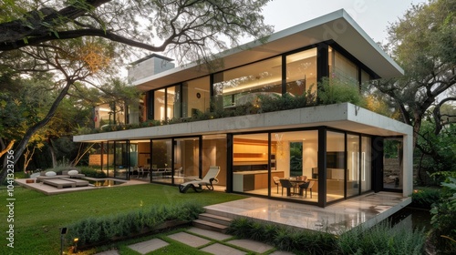 architecture, design, exterior, home, landscape, contemporary, living, structure, garden, natural, line, glasses, sunlight, roomy, luxury, layout, peaceful, aesthetic, environment, residential, elegant, modernity, daylight, seamless, terrace, style, peacefulness, tree, wall, harmony, beauty, innovative, relaxing, artistic, surrounding, patio, greenery, setting, chic, view, atmosphere, inspiration, comfort, space