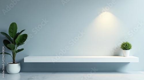 Modern minimalist interior design featuring a floating shelf with potted plants against a serene blue wall