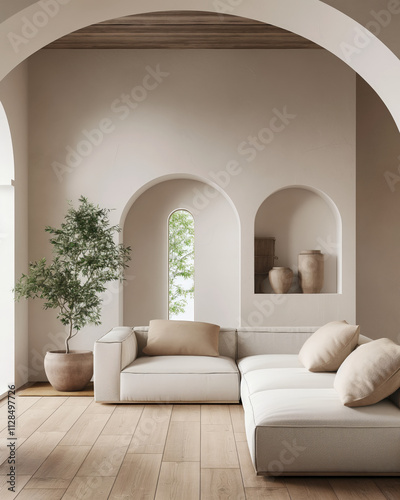 Modern Minimalist Interior with Arched Windows and Neutral Tones