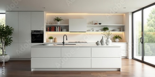 Modern minimalist kitchen design with sleek white cabinetry, integrated appliances, and a spacious island