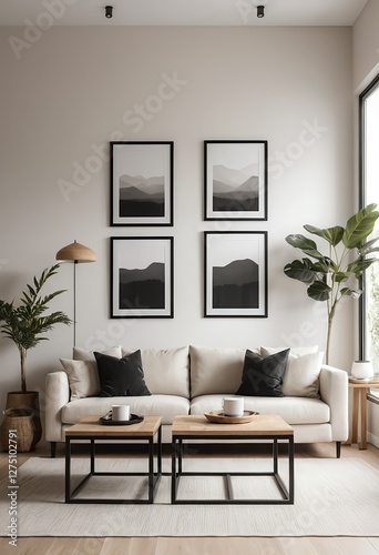 Modern Minimalist Living Room Interior with Beige Sofa and Wooden Coffee Tables