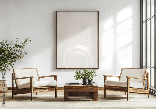 Modern Minimalist Living Room Mockup: A serene and stylish living room with two armchairs, a coffee table, and a large framed canvas, perfect for showcasing your art or design projects.