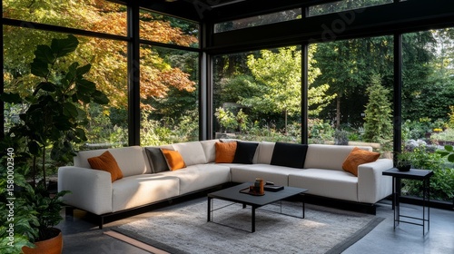 Modern minimalist living room with large sectional sofa facing expansive fullheight windows overlooking lush green garden, natural light, neutral tones, sleek design, indooroutdoor harmony