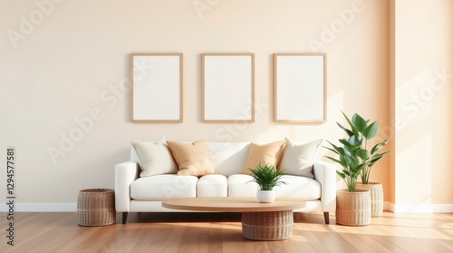 Modern minimalist living room with white sofa, wooden furniture, and blank frames