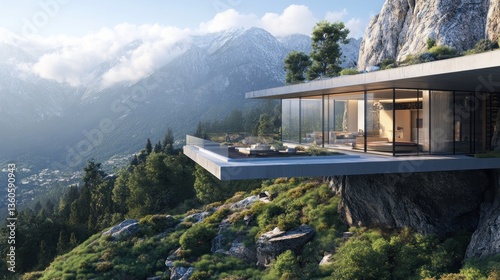 Modern mountain glass house perched on cliffside with breathtaking vista view