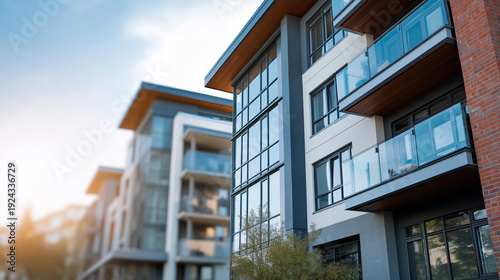 Modern multi-story apartment building featuring a striking mix of brick, concrete, and glass materials with large panoramic windows, defocused urban street background,