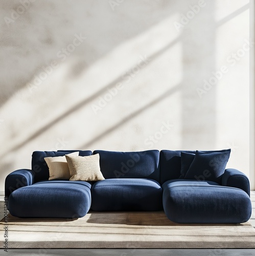 Modern navy blue sectional sofa with soft beige cushions in a minimalist living room. Interior mockup with clean walls for pictures, posters, paintings, sculptures, and other wall art.