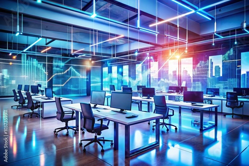 Modern neon cyberpunk open space office interior blurred with information technology overlay. Corporate strategy for finance, operations, marketing. Tables with computers for work. Technology