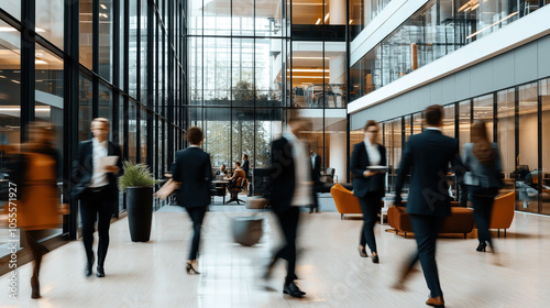 Modern office building interior with blurred motion of business people walking in a spacious lobby featuring glass walls and lounge area with contemporary furniture.