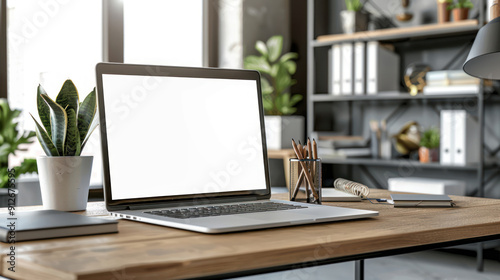 Modern office desk setup with a laptop featuring an empty display, ideal for adding your content