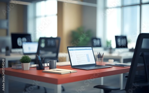 Modern office desk with laptop and accessories displayed in bright workspace setting