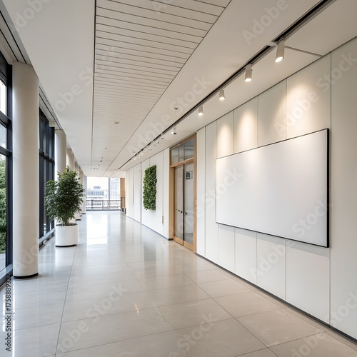 office, hallway, corridor, modern, contemporary, interior, design, architecture, building, space, empty, clean, minimalist, light, bright, natural, window, plant, green, tree, decoration, wall, board, meeting, conference, business, corporate, professional, workplace, environment, passage, paseo, floor, ceiling, lighting, door, glasses, perspective, long, straight, path, neutral, scene, view, indoor