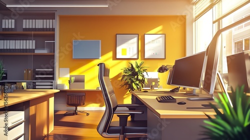 Modern office interior design workspace desk chair computer plants sunlight yellow wall art decor bright 100