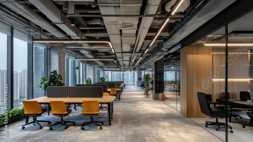 Modern office interior with an open-plan layout, large desks, and subtle decor. Bright natural lighting and clean lines create a professional ambiance.