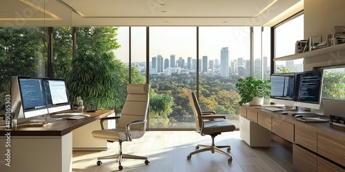 office, modern, interior, city, view, furniture, large, window, natural, light, urban, landscape, minimalist, design, workspace, technology, monitor, plant, comfort, professional, contemporary, bright, environment, open, space, aesthetic, architecture, layout, decor, greenery, business, productivity, cosy, stylish, wood