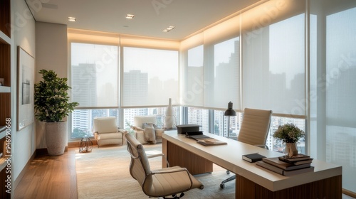 office, modern, interior, design, desk, chair, window, city, view, city landscape, blind, white, wood, floor, lamp, carpet, bookshelf, wall, light, ceiling, glasses, vase, plant, book, furniture, contemporary, elegant, roomy, bright, airy, professional, workspace, sleek, minimalist