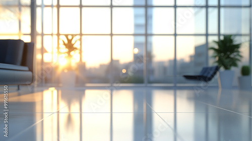 Modern Office Interior with Panoramic Windows at Sunset, Corporate headquarters at sunset, with golden light streaming through floor-to-ceiling windows.