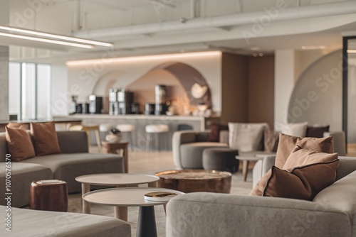Modern Office Lounge Area. A stylish and inviting lounge area in a modern office, featuring plush seating, round tables, ample natural light, and coffee station. Ideal for informal meetings, breaks.