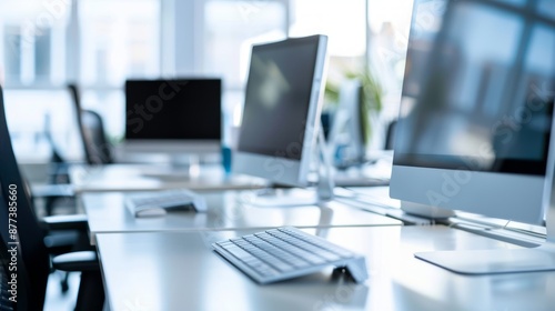 office, workspace, desk, computer, monitor, keyboard, modern, clean, white, chair, technology, business, work, professional, setup, desktop, mouse, corporate, productivity, digital, minimalist, background, blurred, grey, light, bright
