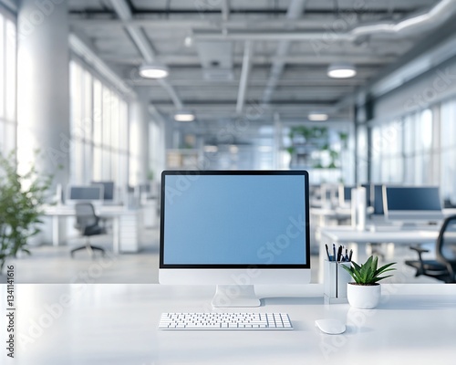 office, workspace, desktop, computer, keyboard, mouse, plant, potted plants, modern, minimalist, clean, bright, roomy, business building, workstation, monitor, screen, blank screen, peripheral, technology, desk, table, white, silver, grey, blue, background, blurred, out of focus, empty, simple, organised, professional, stylish, elegant, aesthetic, productivity, efficiency, workplace, setup, equipment