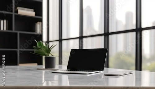 Modern Office Workspace with Laptop on Table for Business. Copy Space Available