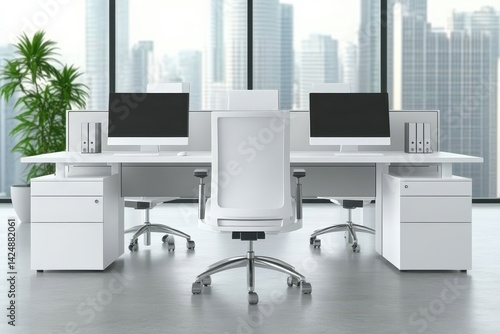 Modern office workstations with sleek white desks and ergonomic chairs, set against a city skyline backdrop. Clean and professional aesthetic