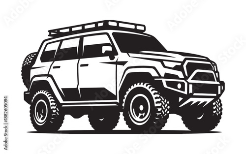 suv, offroad, vehicle, truck, transport, automotive, adventure, rugged, expedition, mountain, travel, exploration, vector, illustration, black, white, isolated, silhouette, monochrome, trail, tire, wheel, bumper, design, element, graphic, icon, logotype, signs, symbol, safari, utility, motor, engine, car, modern, sleek, high contrast