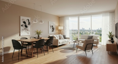 living room, dining room, modern, contemporary, apartment, condo, real estate, interior design, home decor, furniture, sofa, couch, dining table, chair, window, natural light, daylight, city view, skyline, urban, architecture, residential, elegance, stylish, bright, roomy, clean, minimalist, wooden floor, balcony, view