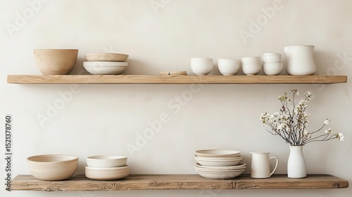 Modern open shelving with neutral pottery and linen textures, minimalist organic storage
